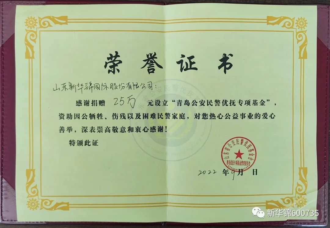 9月22日,在烈士纪念日前夕,山东新华锦国际股份有限公司与青岛市公安局优抚专项基金管理委员会在新华锦发展大厦举行捐赠仪式,公司董事长张航代表新华锦,向山东省公安民警优抚基金会青岛优抚专项基金管理委员会捐赠人民币25万元,以实际行动致敬英雄模范、支持公安优抚事业。